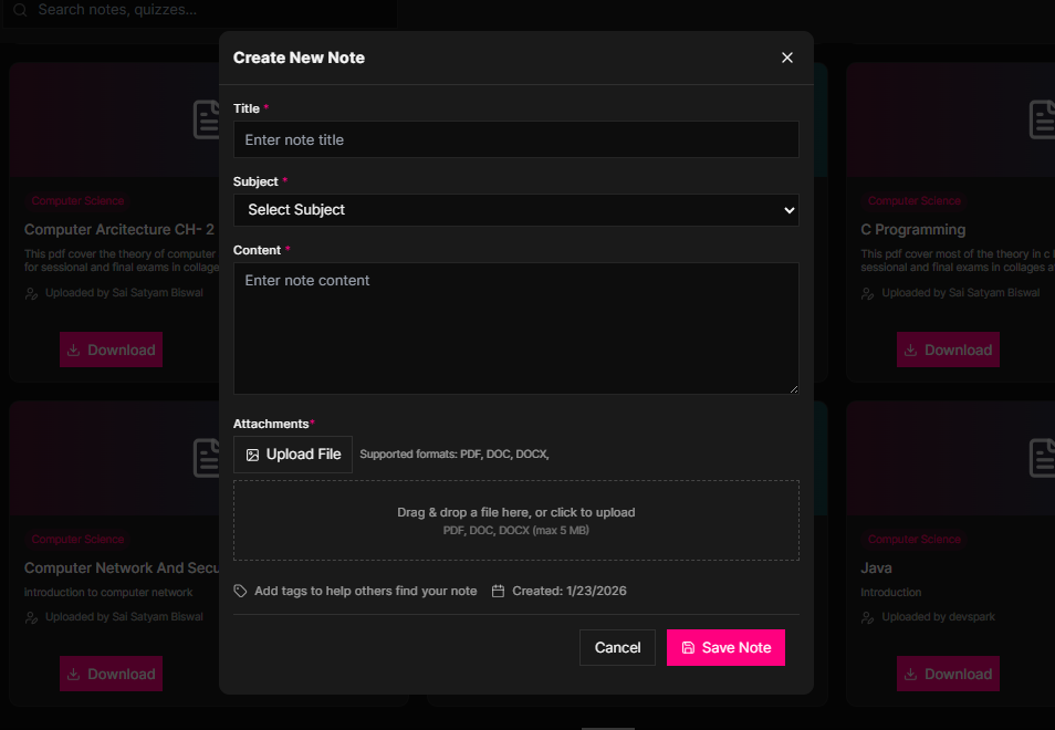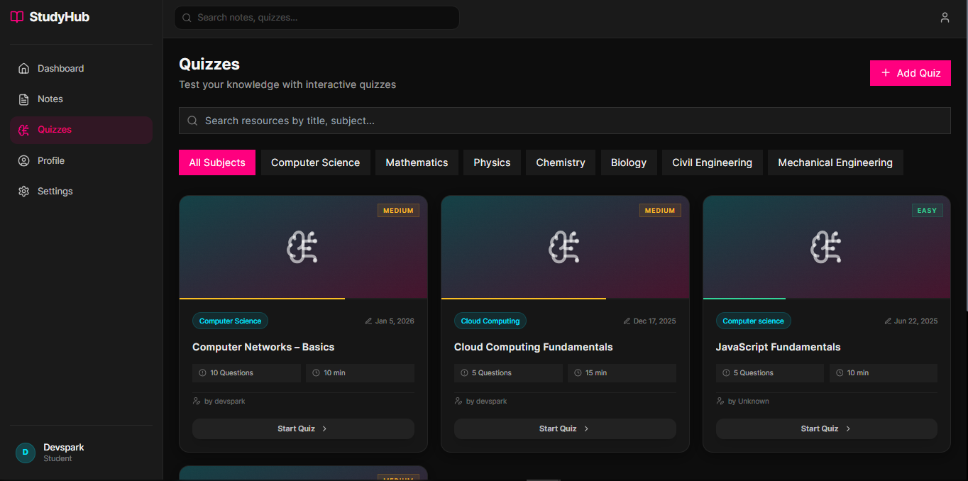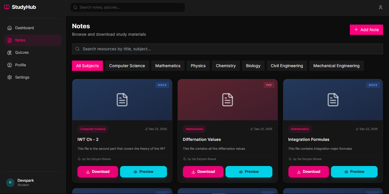 StudyHub is a web application designed to help students learn more effectively by combining note-sharing and quiz-based self-assessment. The platform focuses on simplicity and usability, allowing students to quickly find relevant notes and test their understanding using MCQs. It was built as a college minor project with an emphasis on practical features and clean UI.
