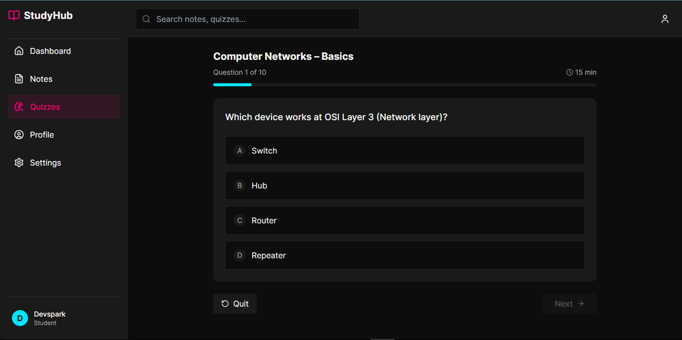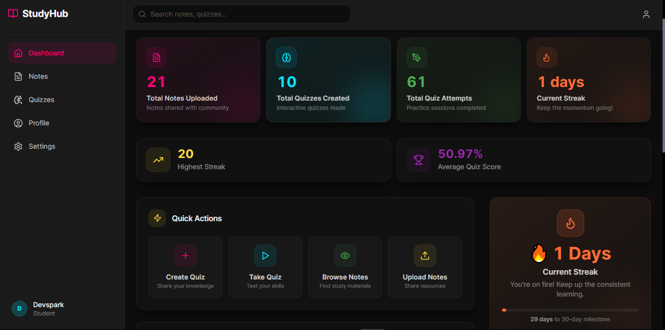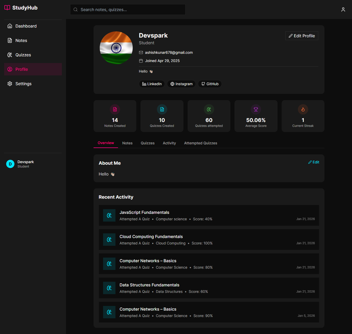 I built StudyHub after noticing how difficult it was for students to manage notes and self-assessment in one place. This project allowed me to apply full-stack concepts while solving a real problem faced by students.